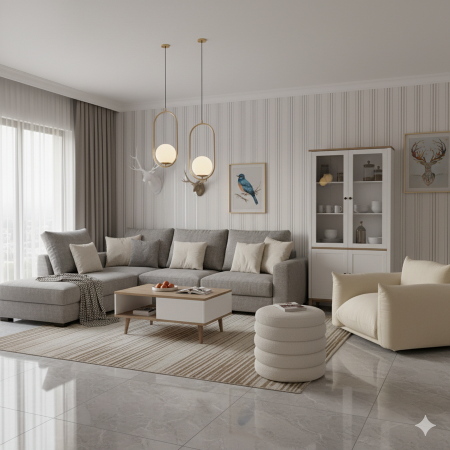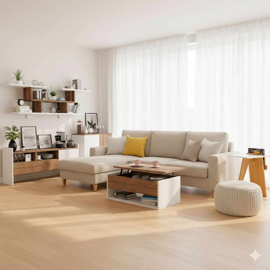Sofa L Shape & Free Chandelier - Beech Wood - Linen Fabric - Multi Color - 270x180x80x80 cm