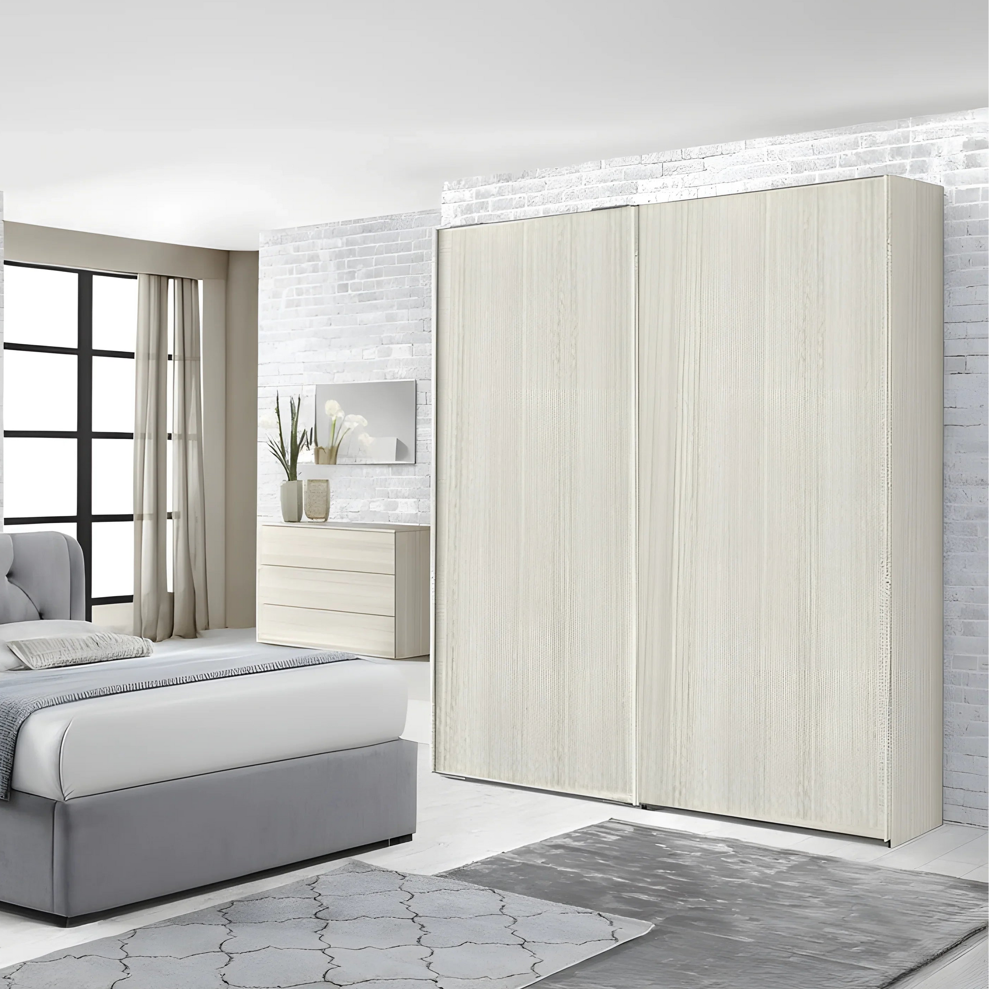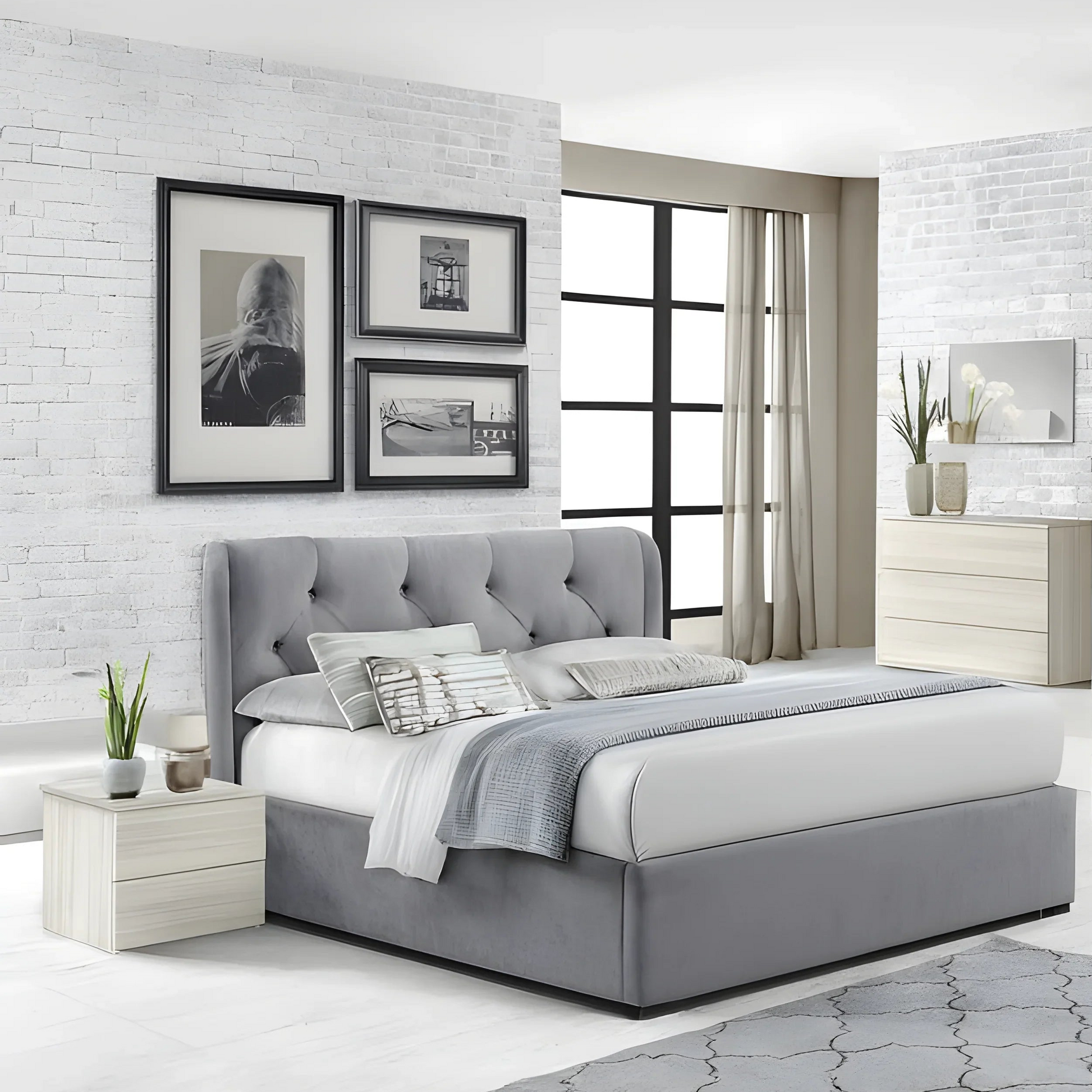 This modern bedroom set includes a sleek bed, spacious wardrobe, and two matching commodes, all crafted from durable MDF for a contemporary finish. The clean lines and minimalist design create a stylish yet functional atmosphere, with storage solutions that blend seamlessly into the space. Available in two elegant fabric options — velvet Or linen — the set adds a touch of sophistication and comfort to any home.