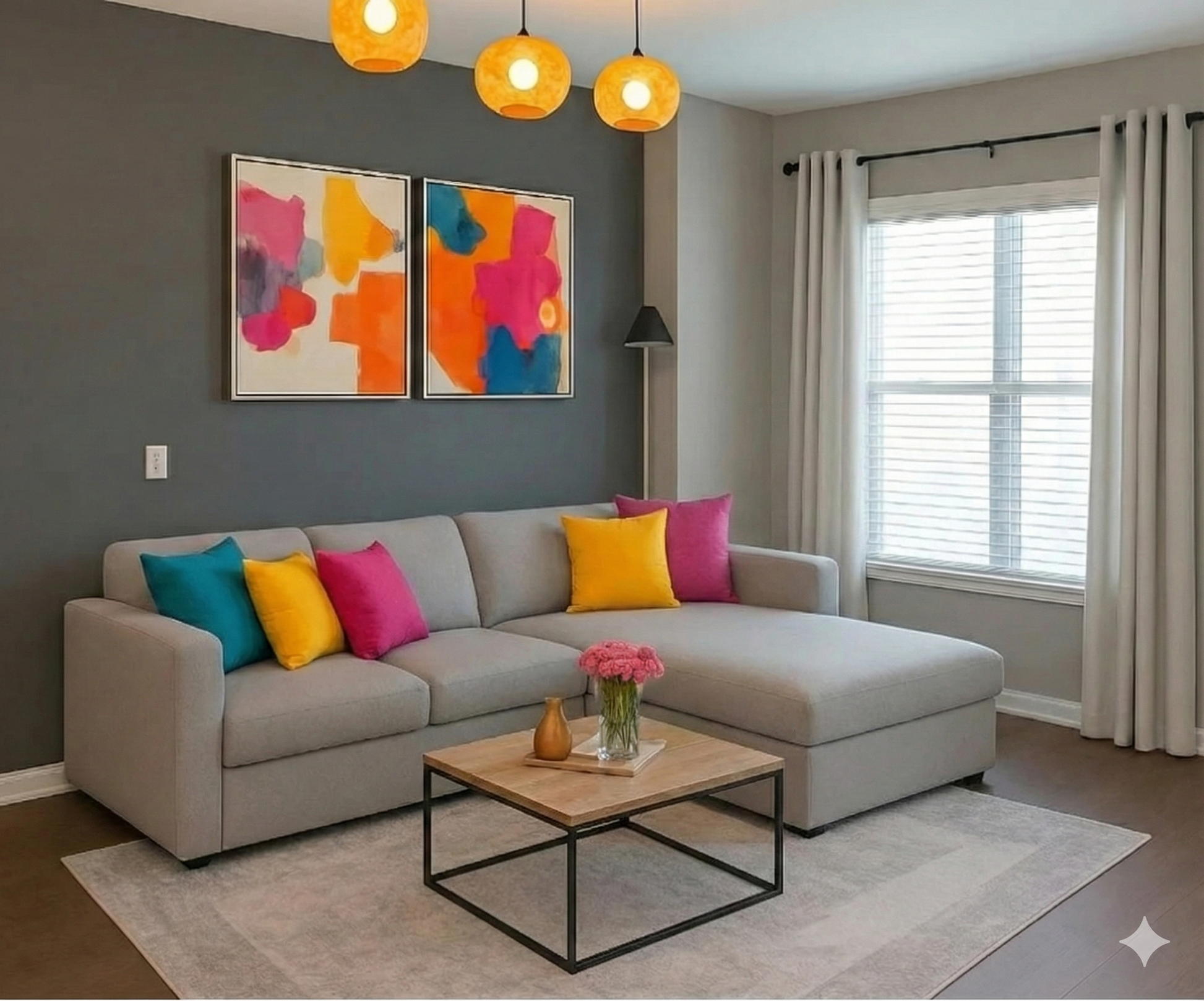 Stylish L-shape sofa crafted from sturdy natural wood with vibrant Gray upholstery. Combines comfort, durability, and a lively design — a perfect blend of elegance and practicality for any living space.