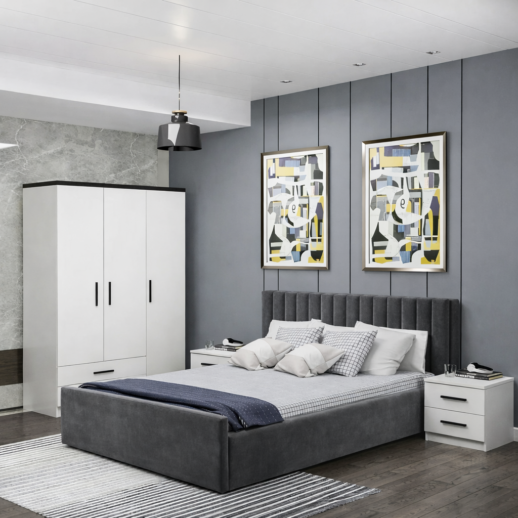 أكمل تجديد غرفة نومك مع طقم أثاث ام دي اف العصري هذا. يتميز هذا الطقم الكامل لغرفة النوم بتصميم أنيق يجمع بين اللونين الأبيض والأسود، ويتضمن قطعًا أساسية مصممة لتحقيق أقصى درجات الراحة والأناقة. يضمن هيكل ام دي اف المتين عمرًا طويلًا مع الحفاظ على مظهر عصري. مثالي لخلق مساحة نوم متناسقة وراقية تجمع بين العملية والتصميم الأنيق. يناسب هذا الطقم متعدد الاستخدامات غرف النوم بجميع أحجامها، ويتكيف مع مختلف أنماط الديكور الداخلي، مع توفير حلول عملية للتخزين والنوم .
