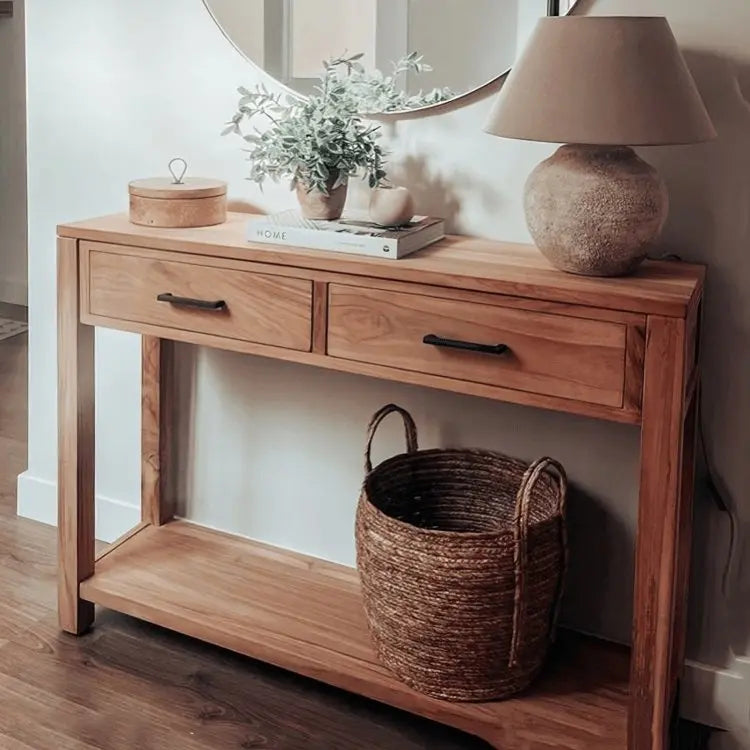 ارتقِ بمساحة معيشتك مع هذه الكونسول الأنيقة المصنوعة من الخشب الطبيعي بلمسة نهائية بنية دافئة. بأبعاد 110 × 35 × 90 سم، توفر سطحًا أنيقًا للديكور والمستلزمات الأساسية مع توفير أقصى قدر من المساحة. مع مرآة قطرها 75 سم، تعكس الضوء بشكل جميل لإضفاء إشراقة على غرفتك وتضفي عليها لمسةً أنيقة. يمزج هذا المزيج بين العملية والتصميم الكلاسيكي، مما يجعله مثاليًا لإنشاء مدخل مُرحّب أو إضفاء لمسة راقية على أي غرفة.