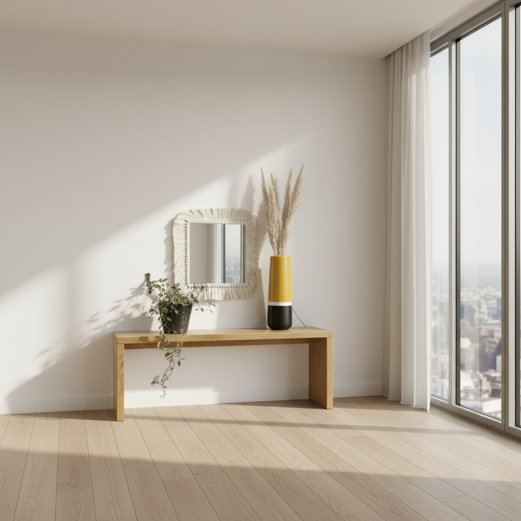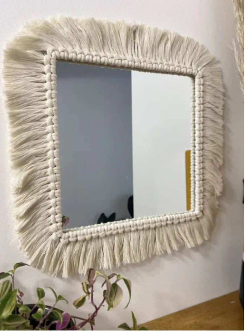 أضف لمسةً من السحر البوهيمي إلى أي غرفة مع مرآة المكرمية هذه، المصنوعة من خيوط قطنية ناعمة بلون ؤف وايت . بقياس 50 × 50 سم، يُحيط تصميمها اليدوي المتقن بالمرآة بشكلٍ جميل، مما يُضفي عليها لمسةً أنيقةً ومريحة. مثالية لتعزيز الإضاءة والمساحة، تجمع هذه المرآة بين الملمس الطبيعي والعملية لتُضفي لمسةً أنيقةً على ديكور منزلك.