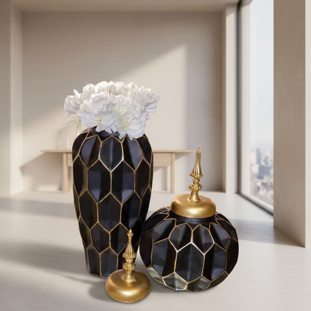 حسّن ديكور منزلك بهذه المزهرية الرائعة المصنوعة من البوليستر باللونين الأسود والذهبي، والمتوفرة بأحجام متعددة تناسب مساحتك تمامًا. لمستها النهائية الأنيقة وتناغم ألوانها الراقي يضفيان لمسة عصرية على أي غرفة، بينما تضمن مادة البوليستر المتينة جمالًا يدوم طويلًا. مثالية لعرض الزهور الطازجة أو كقطعة فنية أنيقة، تُضفي هذه المزهرية لمسةً مميزة على ديكور منزلك.