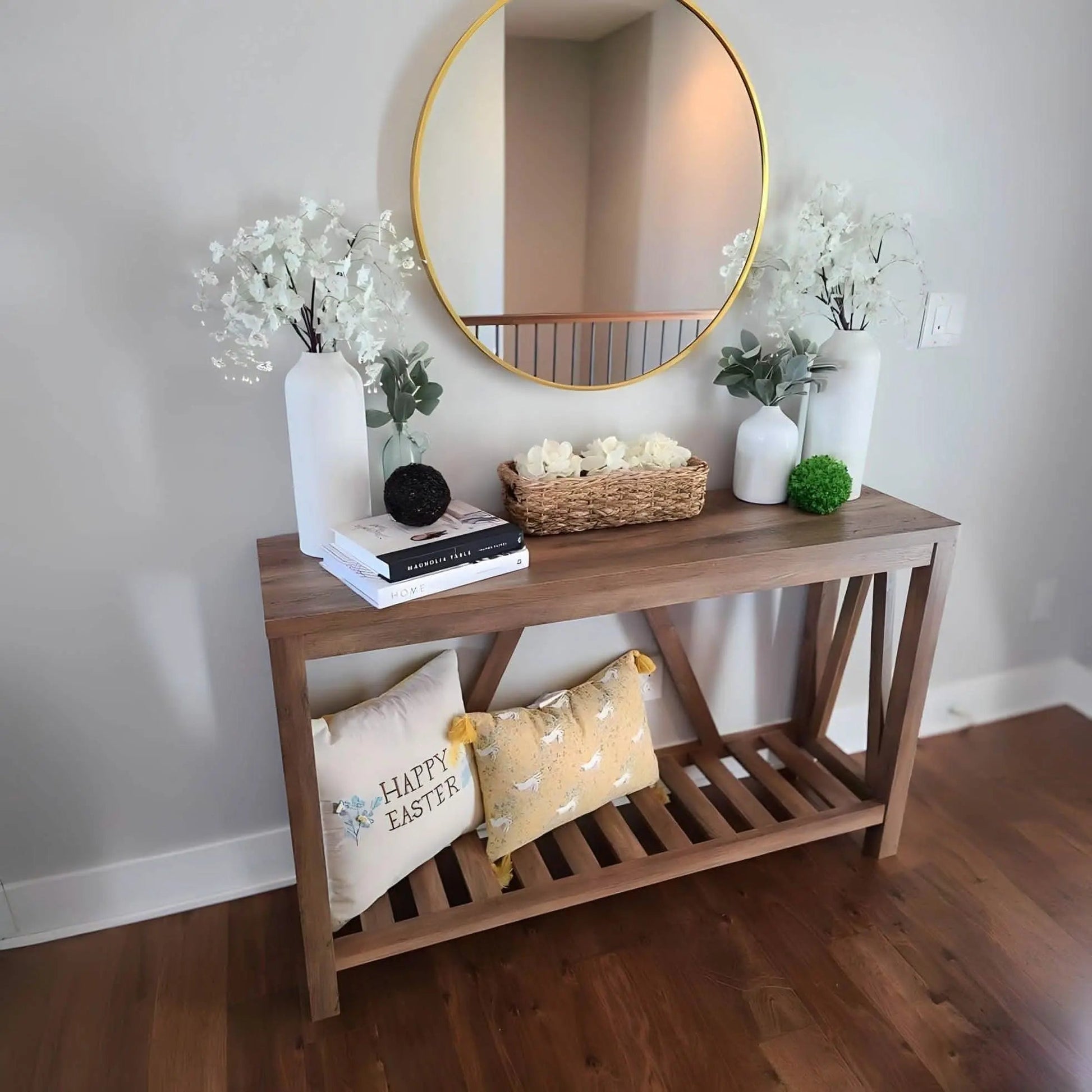تجمع هذه الكونسول المصنوعة من الخشب الطبيعي باللون البني الدافئ بين التصميم الأنيق والأبعاد العملية (111×29×90 سم) لتُضفي لمسةً جماليةً على أي مدخل أو مساحة معيشة. تُضفي مرآة قطرها 60 سم عمقًا وإضاءةً رائعةً، مع توفير مساحة أنيقة لتنظيم أغراضك الأساسية. تصميمها البسيط والجذاب يجعلها مزيجًا مثاليًا بين العملية والأناقة الطبيعية لمنزلك.